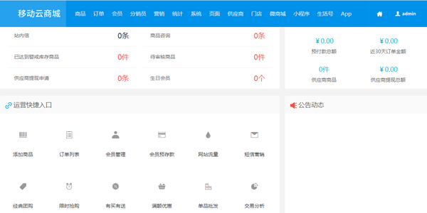 6、后(hou)臺支持系統包含商(shang)品管(guan)(guan)理(li)(li)(li)、訂(ding)單管(guan)(guan)理(li)(li)(li)、會員管(guan)(guan)理(li)(li)(li)、分(fen)銷(xiao)(xiao)員管(guan)(guan)理(li)(li)(li)、營銷(xiao)(xiao)中心、統計分(fen)析、基本(ben)設置、頁面管(guan)(guan)理(li)(li)(li)、供應商(shang)管(guan)(guan)理(li)(li)(li)、門(men)店管(guan)(guan)理(li)(li)(li)、微商(shang)城管(guan)(guan)理(li)(li)(li)、小程序管(guan)(guan)理(li)(li)(li)、生活號設置等模塊。