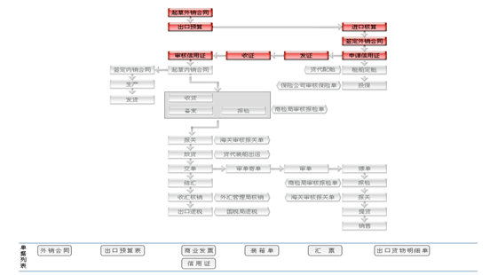 業務流程(cheng):CIF+L/C,CIF+/D/A,CIF+D/P,CIF+T/T Before shipment CIF+T/T After shipment FOB+L/C,FOB+/D/A,FOB+D/P,FOB+T/T Before shipment FOB+T/T After shipment CFR+L/C,CFR+/D/A,CFR+D/P,CFR+T/T Before shipment CFR+T/T After shipment 業務流程(cheng):在這(zhe)里填(tian)寫和查(cha)看所需要的單(dan)據(ju)。直(zhi)接可在流程(cheng)圖中表現。查(cha)看的單(dan)據(ju)分填(tian)寫的單(dan)據(ju)和收到(dao)的單(dan)據(ju)
