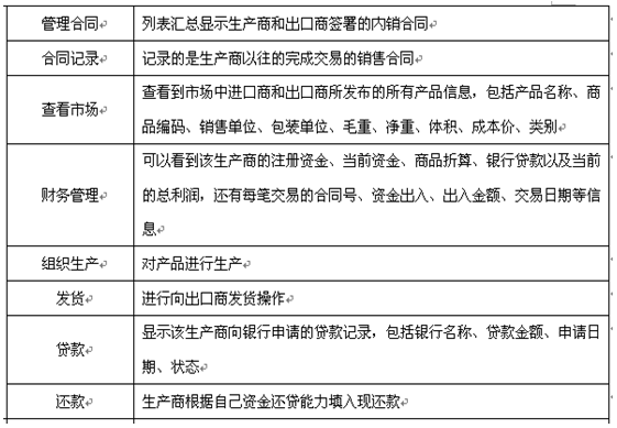 7、可以配置(zhi)進(jin)(jin)口(kou)商(shang)(shang)、出口(kou)商(shang)(shang)、進(jin)(jin)口(kou)地銀行(xing)(xing)、出口(kou)地銀行(xing)(xing)、國稅局(ju)(ju)(ju)、海關(guan)、商(shang)(shang)檢局(ju)(ju)(ju)、保(bao)險公司(si)、貨(huo)代公司(si)、外匯(hui)(hui)管(guan)理(li)局(ju)(ju)(ju)等相關(guan)參數和業(ye)務,在實訓過程中可以分組、分角色進(jin)(jin)行(xing)(xing)互(hu)動(dong)、交(jiao)互(hu)式(shi)訓練。角色扮演:出口(kou)商(shang)(shang)、進(jin)(jin)口(kou)商(shang)(shang)、生產商(shang)(shang)(工廠)、進(jin)(jin)口(kou)銀行(xing)(xing)、出口(kou)銀行(xing)(xing)、保(bao)險公司(si)、商(shang)(shang)檢局(ju)(ju)(ju)、海關(guan)、外匯(hui)(hui)管(guan)理(li)局(ju)(ju)(ju)、貨(huo)代、國稅局(ju)(ju)(ju)