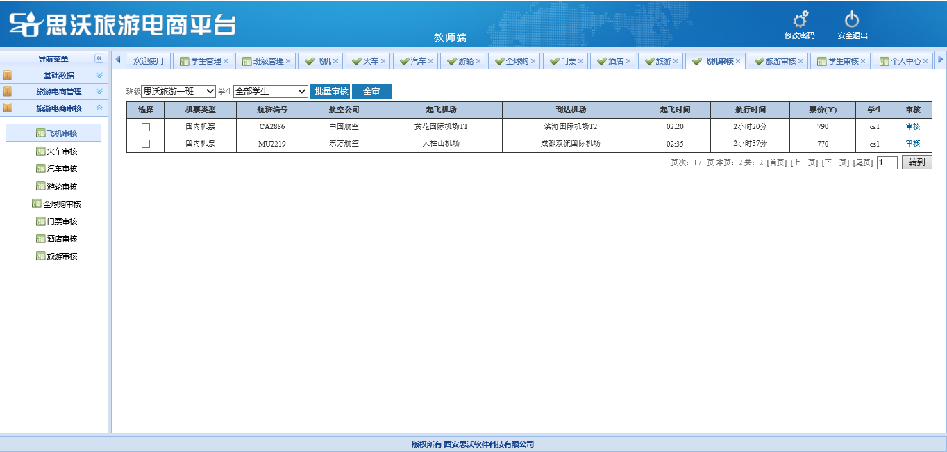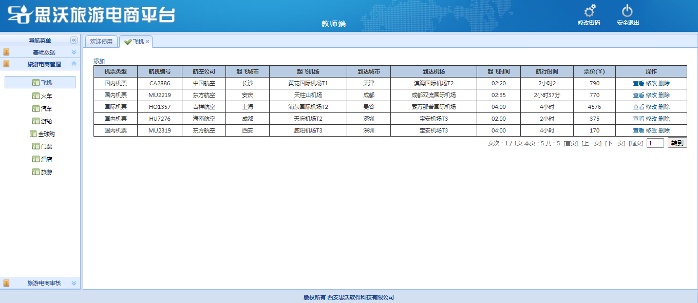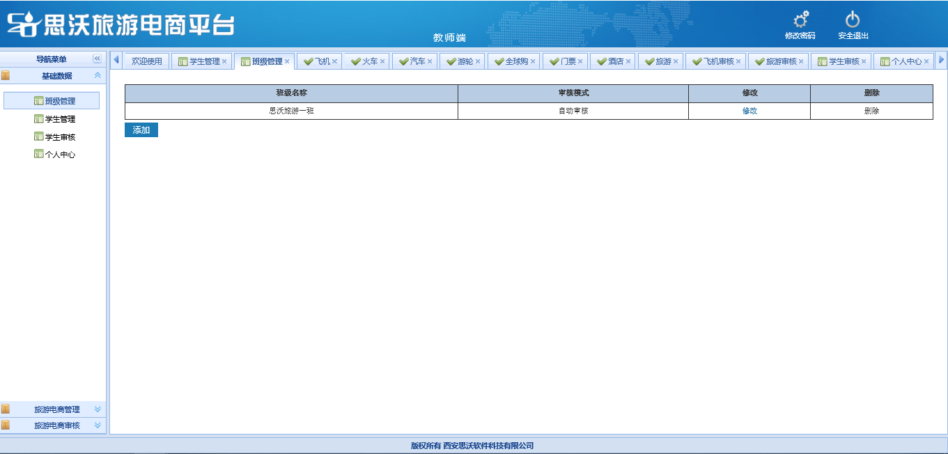 教師端包括:基礎(chu)數(shu)據(班級管理、學(xue)生管理、學(xue)生審(shen)核、個人信息);旅(lv)游(you)電商管理(對學(xue)生發布已審(shen)核的飛(fei)機、火車、汽車、游(you)輪、全(quan)球(qiu)購、門票、酒店、旅(lv)游(you)產品(pin)信息進行管理);旅(lv)游(you)電商審(shen)核(對學(xue)生發布的飛(fei)機、火車、汽車、游(you)輪、全(quan)球(qiu)購、門票、酒店、旅(lv)游(you)產品(pin)信息進行進行審(shen)核)。