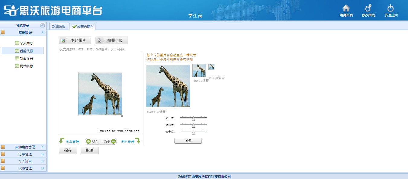 學(xue)生后(hou)臺網站頁面(mian)個性化操作,可通過攝像(xiang)頭等設備進行(xing)頭像(xiang)拍照上傳、也可上傳本(ben)地照片,行(xing)網站名稱及封面(mian)設置。并進行(xing)飛(fei)機、火(huo)車、汽車、游輪(lun)、全球購、門票、酒店、旅游產品、旅游攻略等信息添加發布。