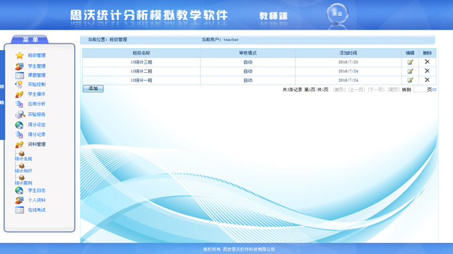 【學生端功能】:統計(ji)調查、統計(ji)法(fa)規、統計(ji)知識、統計(ji)案例、應用分(fen)析、實驗筆(bi)記、實驗報告(gao)、個人資(zi)料、在(zai)線考(kao)試(shi)、幫助、退出(chu)系統。