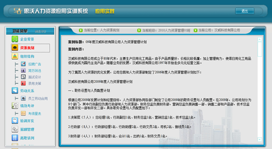 學(xue)生(sheng)端通過教(jiao)師提供的(de)實踐應(ying)用(yong)案例,進行人(ren)力資源規劃、組織(zhi)結構(gou)管(guan)理、勞動(dong)關系管(guan)理和(he)(he)績效考(kao)核(he)、培(pei)訓(xun)發展等(deng)步驟的(de)操(cao)作。操(cao)作流(liu)程明確,思路清晰,學(xue)生(sheng)在輕松的(de)操(cao)作中(zhong),就能很快的(de)體驗到人(ren)力資源管(guan)理的(de)步驟和(he)(he)流(liu)程,學(xue)習并實踐人(ren)力資源管(guan)理中(zhong)的(de)技巧和(he)(he)應(ying)變(bian)。